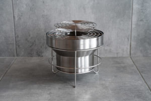 オールステンレス製の七輪で、着火、消火、再着火が本体だけで可能です。
